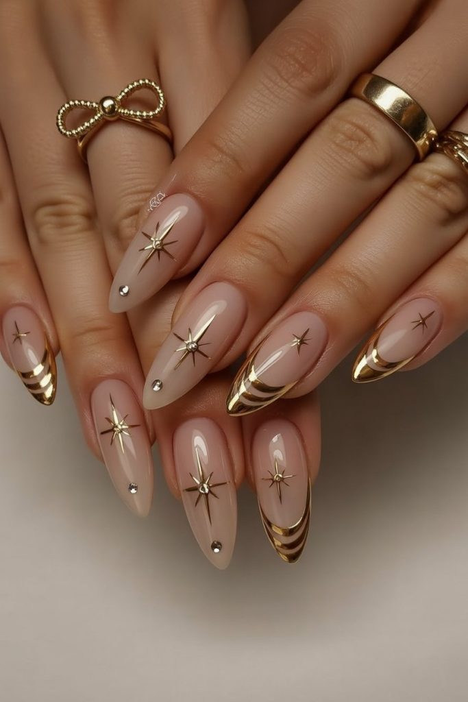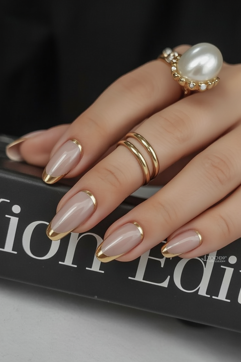 If you want to add a touch of shine to your look without going all out, this is for you. I’ve selected a range of looks to suit every mood, from minimalist chrome and micro-French tips to frosty champs and glittery party moments. Each style focuses on gold accents and can be completed with pieces you own (like gold rings). The base colors and neutral shades that go with warm metallics lip pairs beautifully with gold: black, white, cream, deep wine and berries, jade and emerald, and turquoise blue for a cool pop. Think of these as your thoughtful designs for the 2026 season—modern, flattering, and elegant to the eye.