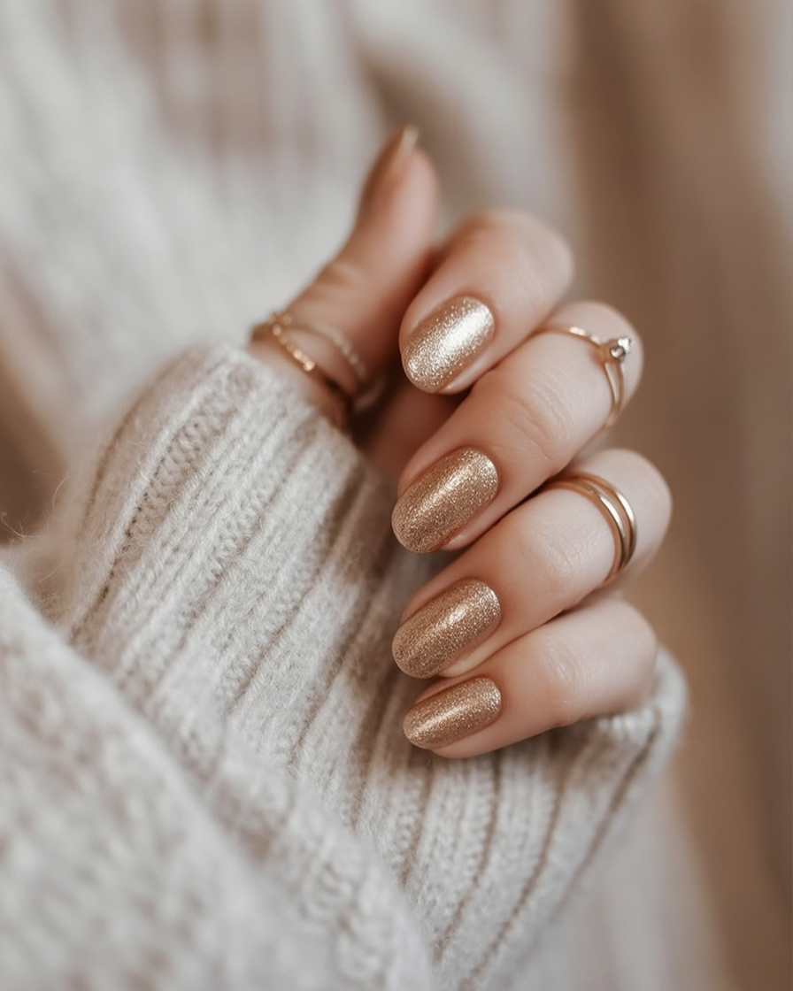 Like a favorite latte, this fine gold glitter reads soft and inviting—sparkly enough to feel special, muted enough for everyday life. It’s the perfect weekend-to-work manicure: simple, chic, and endlessly wearable. The finish nods to cute fall nail color ideas like gold glitter but keeps the texture refined, so it never competes with your outfit. Low-maintenance angle: micro-glitter disguises minor chips and grow-out, making it a smart choice for packed schedules. A single solid tone means quick salon time, and both polish and gel wear beautifully. For coordinated toenails, try Champagne or a gentle brown and taupe to keep the palette cohesive from fingers to toes.