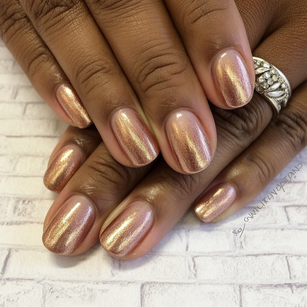 A soft, rose-gold shimmer completes these short nails with an appearance akin to a refreshing glass of water. Youthful and quietly chic, this finish represents the ‘your nails but better’ ideal with warm tones that complement any skin color. Rose gold is the anticipated trend in 2026 as an ideal alternative to high-beam chrome nails. Get the look with a soft gel overlay and finish with rose gold shimmer to achieve a polished look. Dress in soft colors that are rose gold-complementary, like lavender and knits or white and denim.