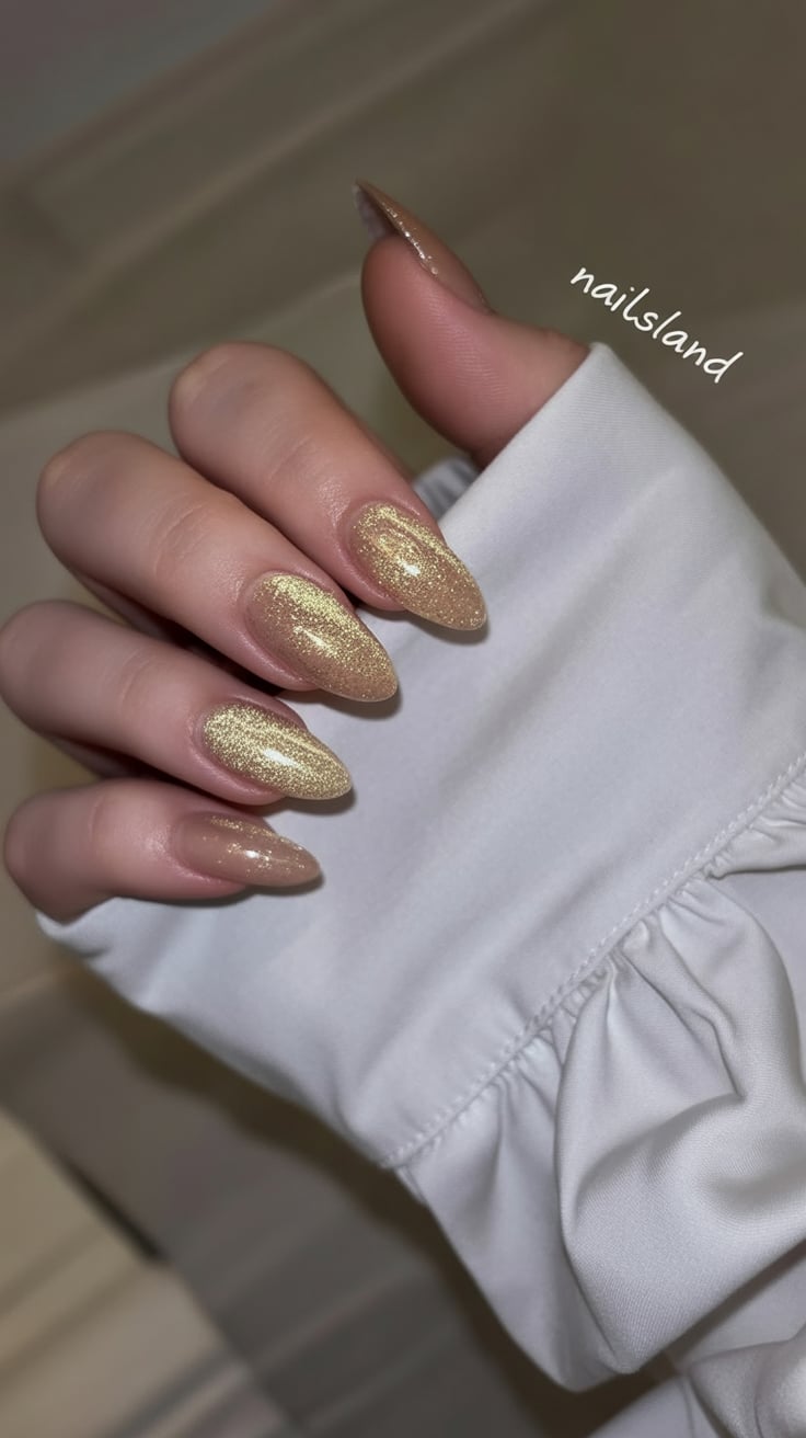 Smooth, glossy, and perfectly almond, this is the little black dress of gold manicures. The finish is luminous rather than loud, which makes it surprisingly versatile—from early coffee to late cocktails. It upgrades even the simplest outfit and photographs beautifully with stacked rings or with gold rings for extra shine. Motivation or inspiration to try it now: 2026 is all about wearable luxury—clean silhouettes, jewelry-inspired tones, and effortless shine. This look works with turquoise blue knits, jade and satin blouses, and classic white and tailoring. Choose gel for longevity or a long-wear polish if you like to alternate designs. For a fingers-and-toes moment, opt for toenails in Champagne for a refined match.