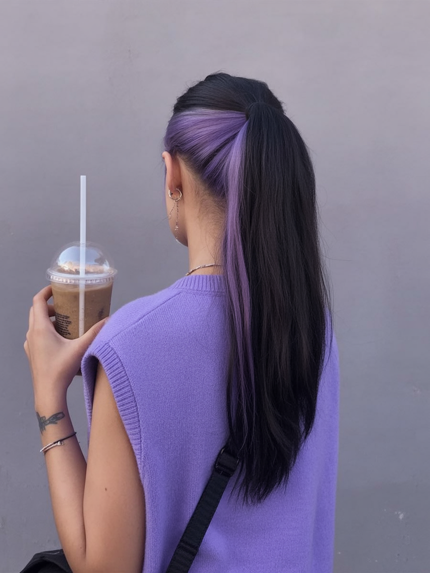 This is such a smart way to do color—clean, sleek, and secretly fun. The deep black ponytail looks classic from the front, but then that purple under streak shows up like a little signature detail. It’s minimal but still makes you look styled and intentional, even on days when you’re basically living on iced coffee and errands.