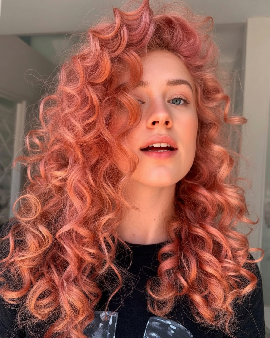 This curly copper-peach shade is sunshine for your face. It feels playful, warm, and kind of effortlessly glamorous—like you’re the friend who always looks good in photos without trying. The color has that soft “lit from within” quality, and the curls make it even more romantic. It’s the kind of inspiration that makes you want to wear gold hoops and a tiny bit of bronzer and call it a day.