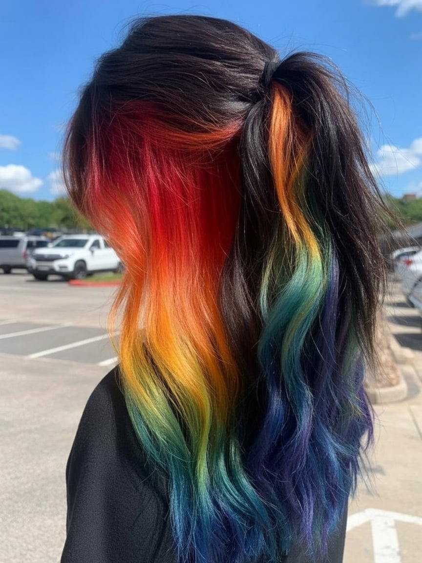 This is pure joy in hair form—like you woke up and chose fun, no apologies. The dark base keeps it grounded, but the under-rainbow sweep (red into warm tones, then green, blue, and deeper jewel shades) makes every swish feel like a mood lift. It’s Alt, it’s confident, and honestly… it’s hard not to adore.