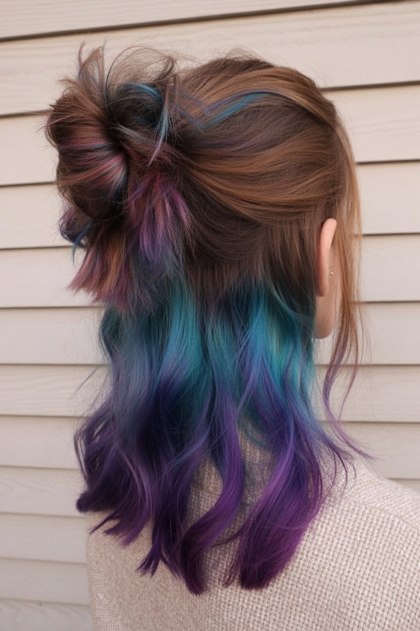 12. Brown Topknot with Under Teal-to-Purple Peekaboo