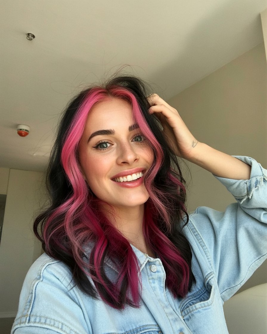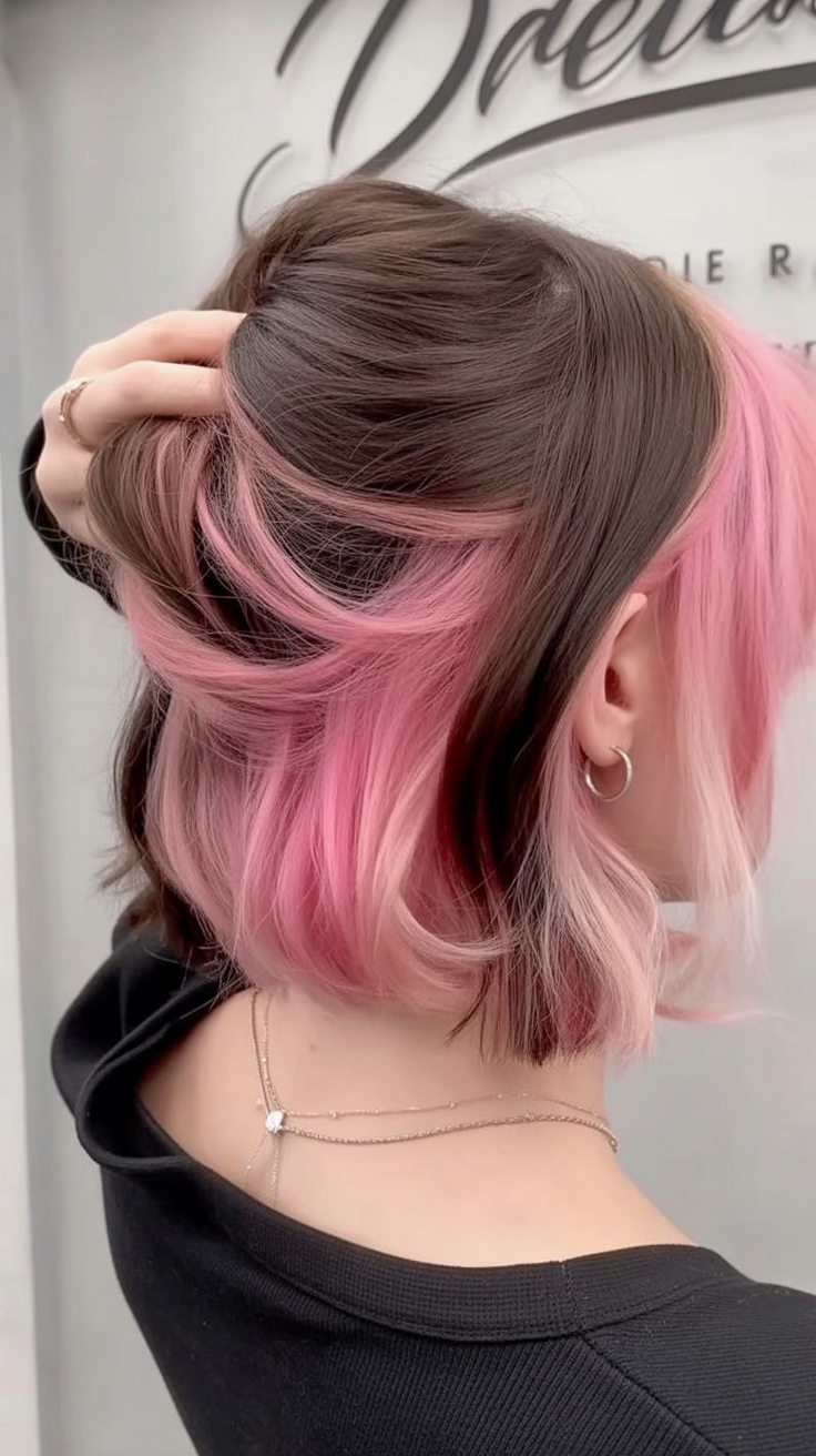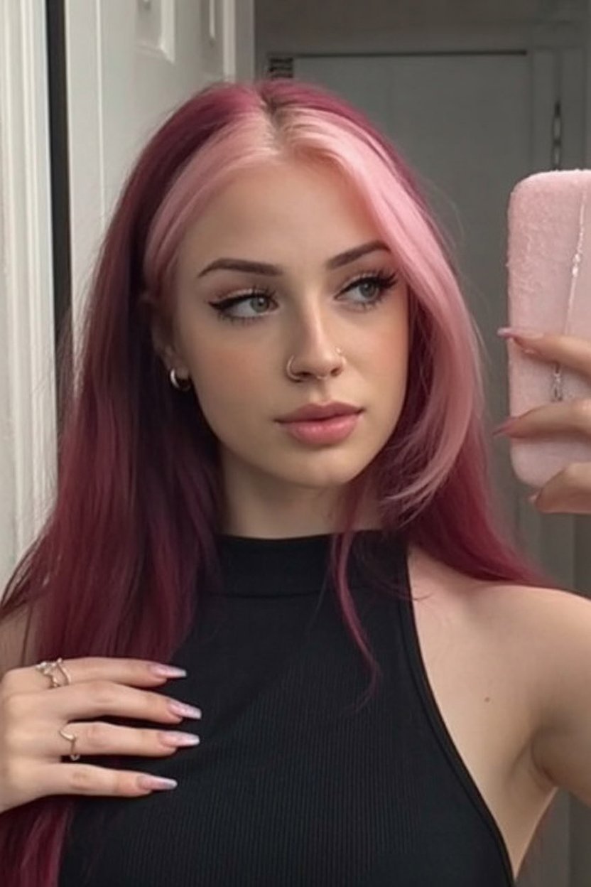 Compared to a full head of pink, this split placement is easier to live with and way more dimensional in photos and real life. Ask your colorist for a soft blend through the mid-lengths so it reads like balayage hair ideas instead of a harsh line. Style with loose waves to show off the contrast, or wear it straight when you want the graphic effect—both look expensive.