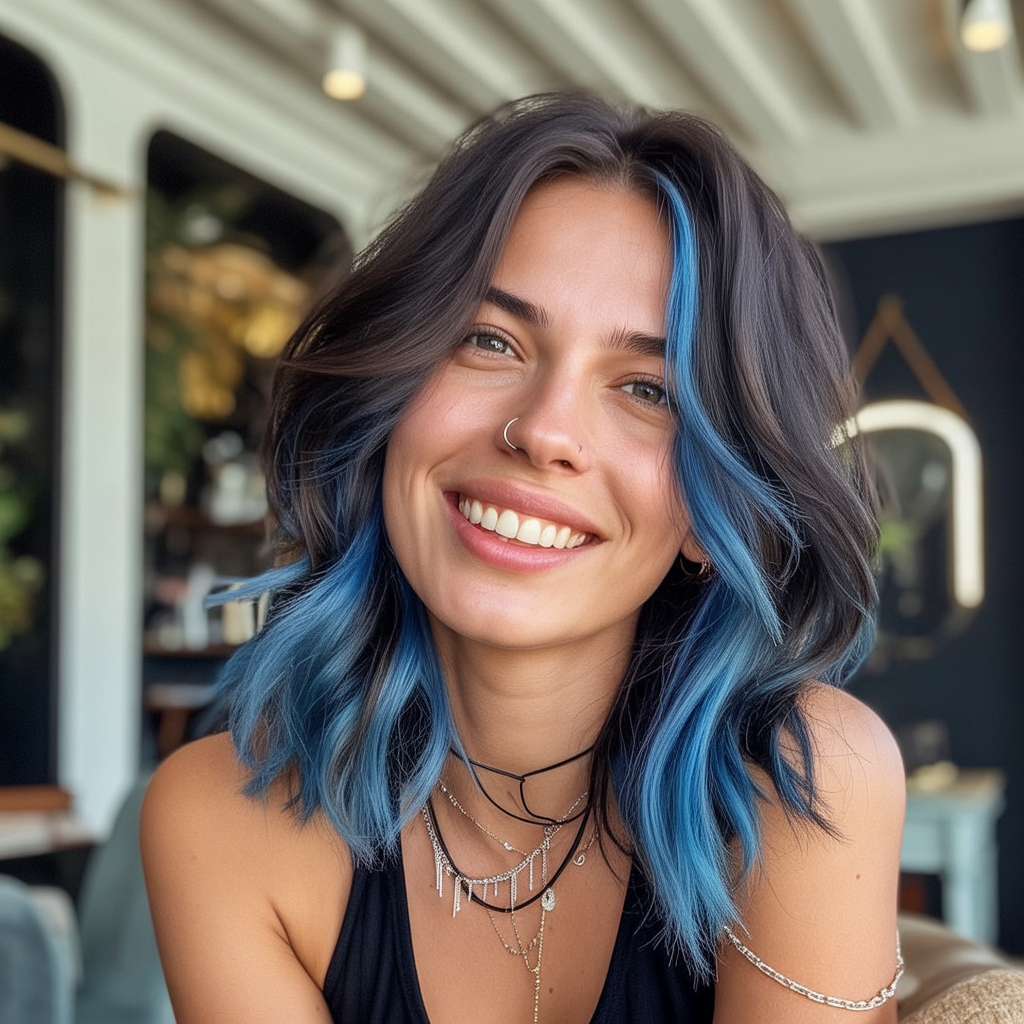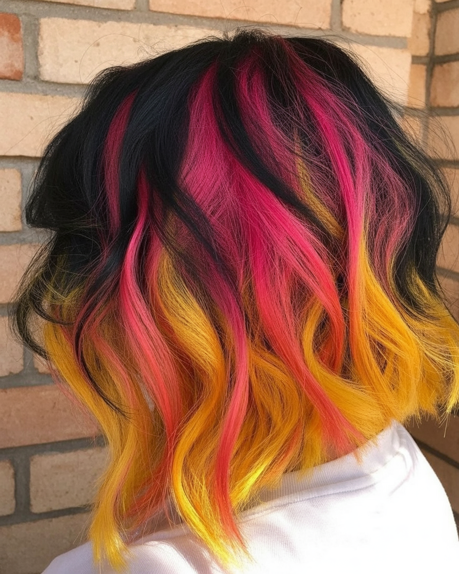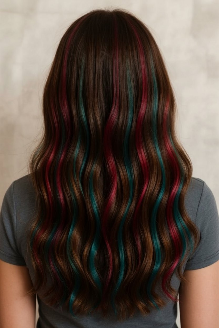 For the best color care routine, keep the bright pieces as peekaboo highlights rather than an all-over dye—less fading drama, more impact. Ask for placement ideas that concentrate the color near the crown and through the mid-lengths so it pops in loose waves. Style it with a heat protectant and a wide-barrel curl or soft bend, then finish with a shine serum to keep the darker base glossy and the colors crisp.