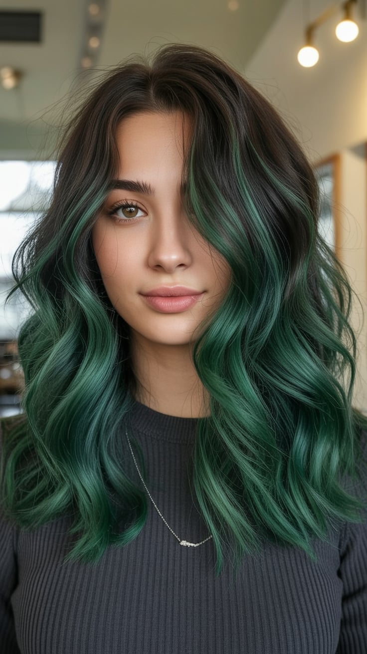 This green is moody in the best way—like a velvet dress, but for your hair. It’s bold without being neon, and the dark base makes it feel grounded and sophisticated. You get that “something different” vibe without losing elegance, which is why it’s such a cool choice for anyone who wants a trendy hair color that still feels grown.