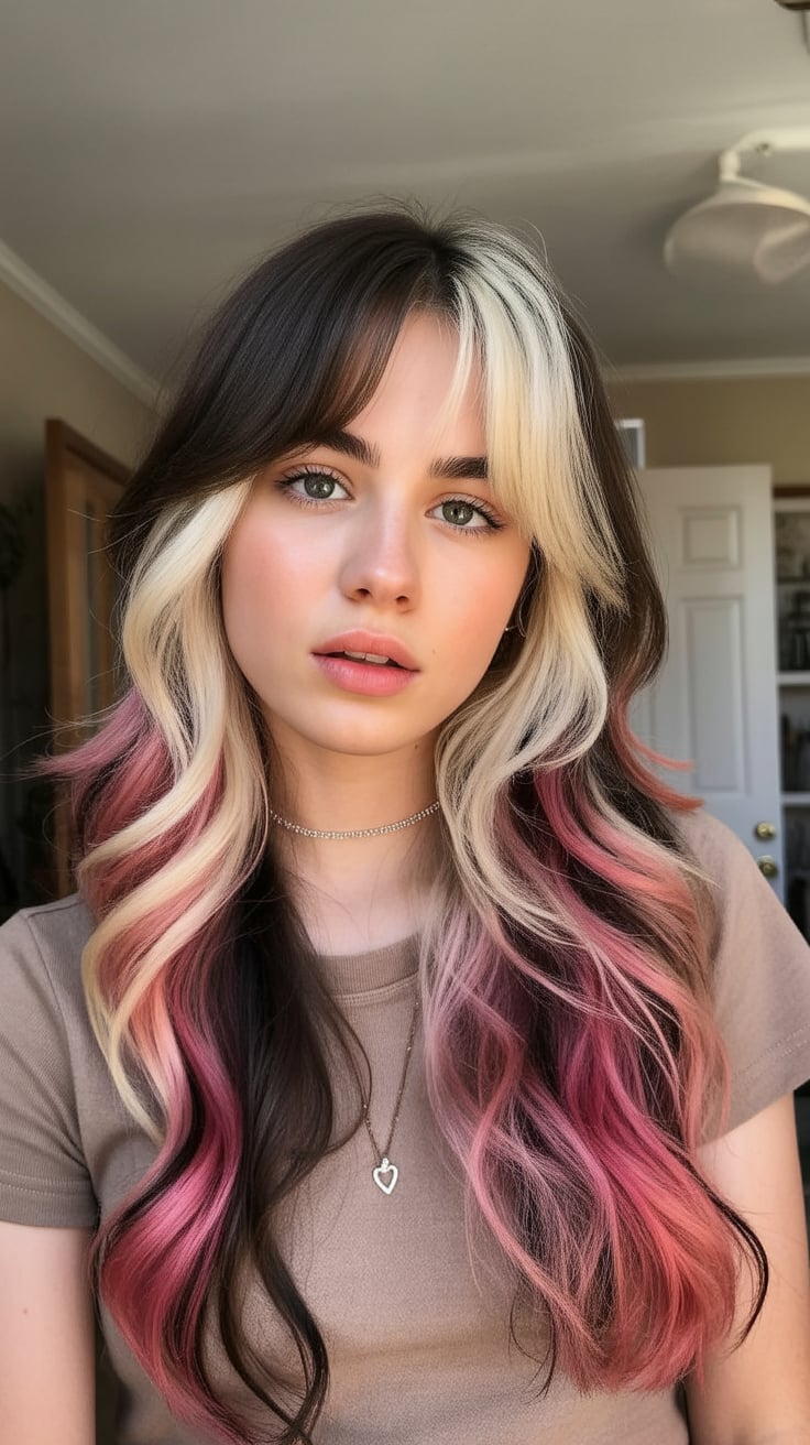 This look is sweet, striking, and a little bit rock-and-roll all at once. The blonde front pieces brighten the face instantly, and the pink ribbons through the lengths add that playful twist that keeps it from feeling basic. It’s the kind of color that makes you look styled even when you’re wearing a plain tee—like your hair is doing the talking.