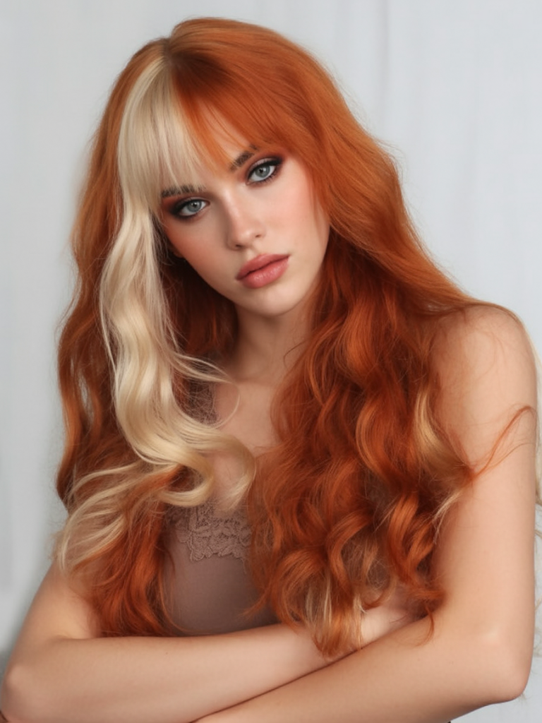 Styling tip: keep the bangs smooth and slightly curved so the blonde panel looks intentional, not accidental. This combo works best on medium to thick hair or finer hair with layers for body. Refresh the red tone with a gloss every few weeks, and keep the blonde panel toned so it stays creamy, not brassy—this is one of those colors where maintenance pays off fast.