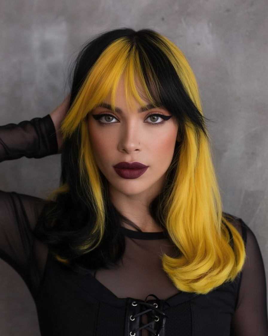 Comparison-wise, split color gives you more impact than peekaboo because the contrast is front and center, but it can still be styled to soften the vibe. Wear it sleek for maximum graphic drama, or add a bend to make it feel a little more relaxed. A purple-toned shampoo won’t help Yellow, so focus on gentle cleansing and a conditioning mask to keep the light side bright and the hair feeling soft.