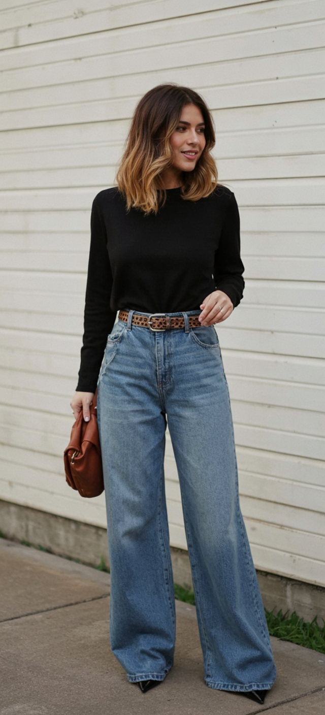 8. Black Knit, Leopard Belt, and Easy Wide Legs