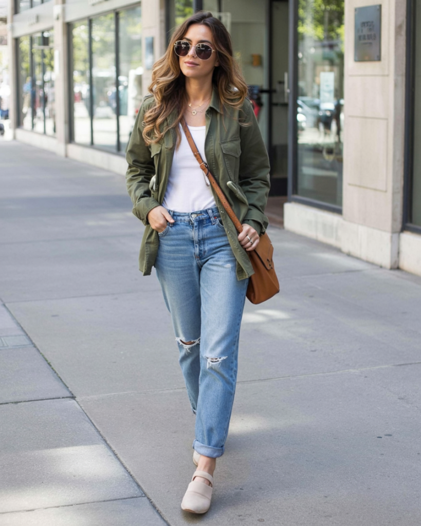 This is the way to approach the concept of the weekend fashion trend: combine the perfect army jacket paired with a white tank alongside ripped jeans that are the color of baby-blue skies and a simple pair of flats that can be slipped right off the foot without losing an excessive level of fashion integrity being maintained. The net result is an easy-going type of fashion trend setup that truly has the ability to give the impression you’re just The overall feel of this look has a bold yet understated quality to it—it’s as if you know what you’re doing and aren’t trying to jump on the latest trend. The straight-leg silhouette flatters almost any figure, while the minimal holes at least prevent the jeans from looking freshly ironed. It’s perfect for women who enjoy relaxed garments but also want their jeans looks to be thoughtfully put together in 2026.