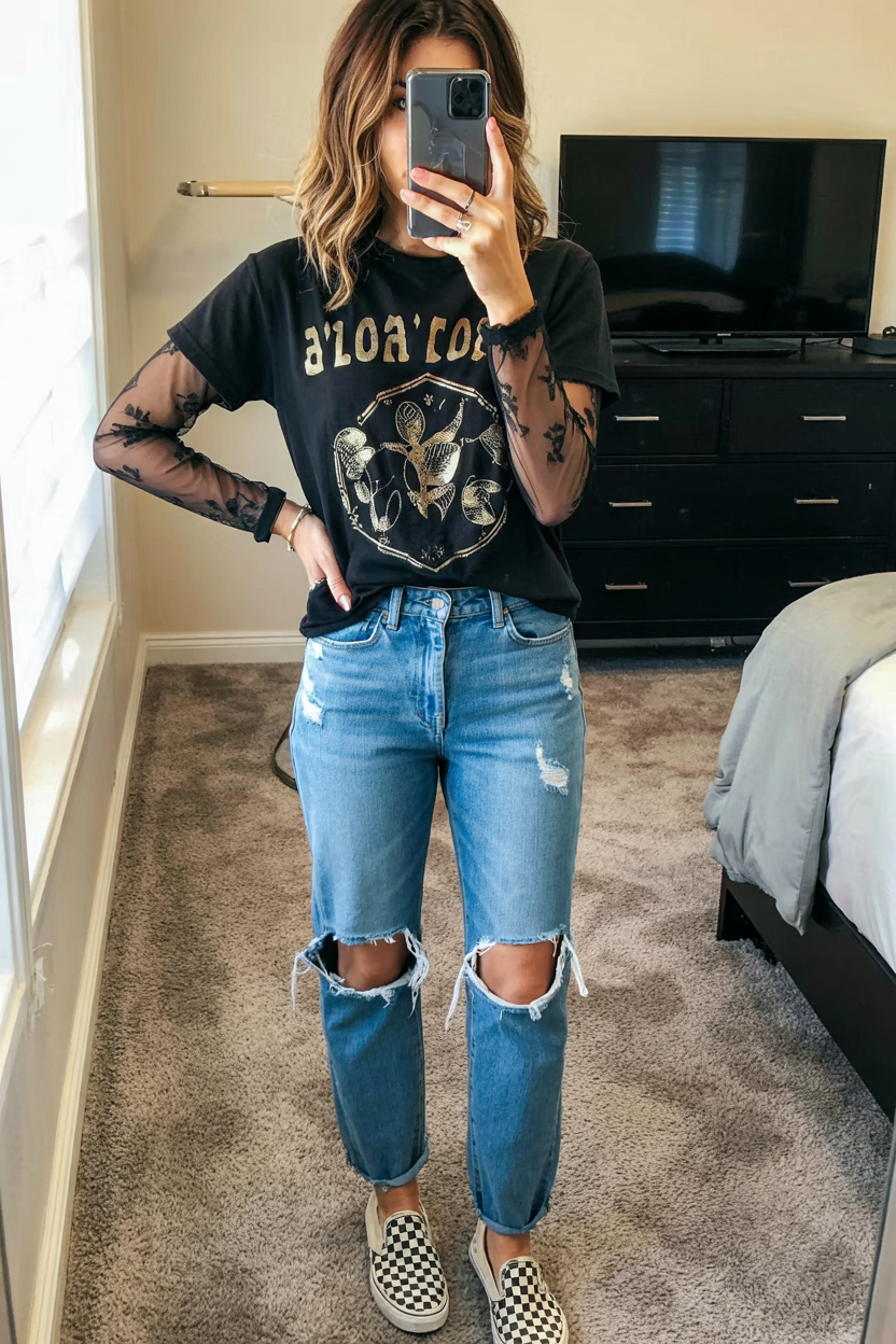 3. Ripped Straight Jeans With a Rock Tee Twist