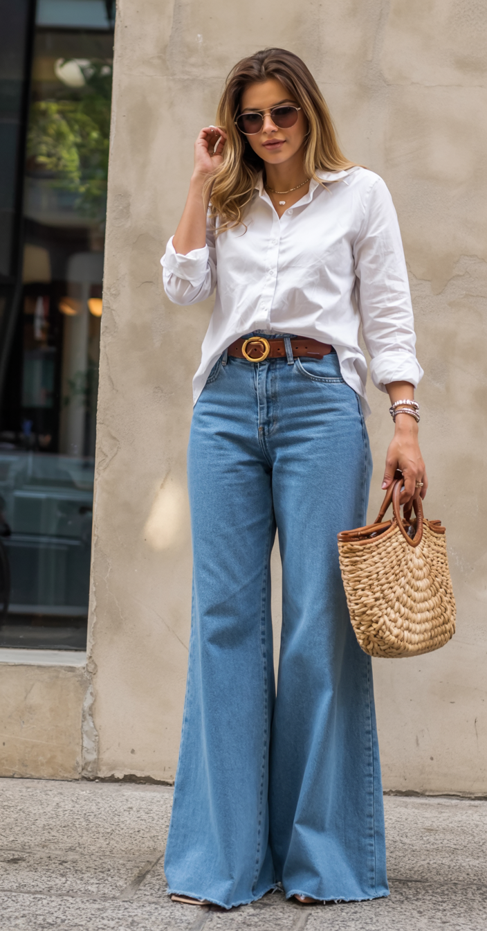 There’s nothing that embodies the feeling of summer quite like a white dress shirt tucked into light blue bell-bottom jeans. The flared legs provide the dramatic swoosh of movement when you walk, but the belt and woven tote bring the outfit firmly back down to earth. Throw in a pair of sunglasses and a scattering of dainty necklaces, and you arrive at a chic yet simple fashion statement that could transition from a city brunch to an evening promenade along the waterfront without so much as a hitch.