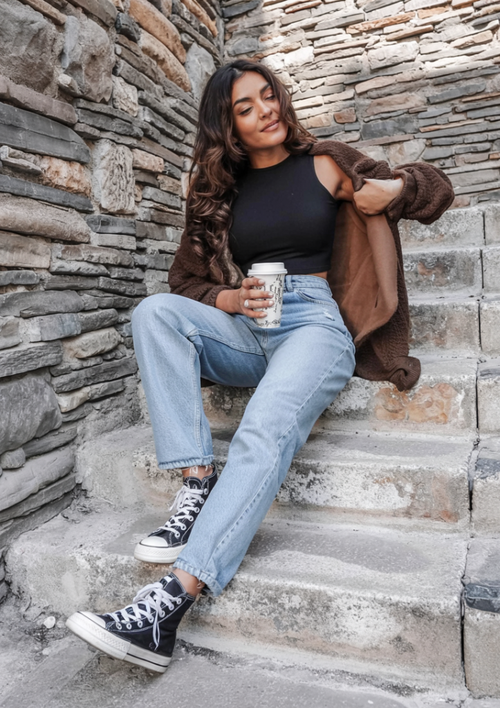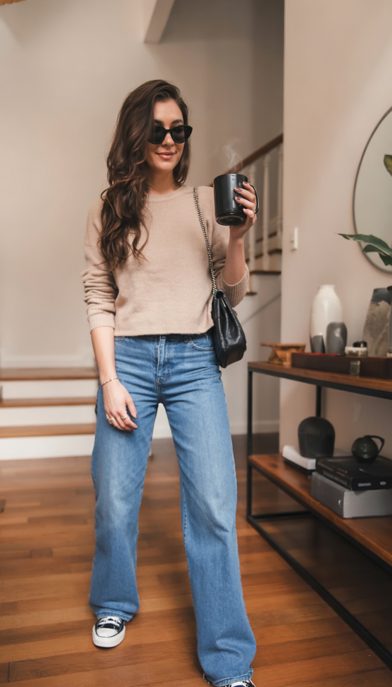 Imagine cool fall air, a latte in your hand, and this outfit wrapping you up in softness: a teddy brown cardigan shrugged over a sleek black tank, paired with easy light blue jeans and classic black high-top sneakers. It’s relaxed and a little nostalgic, like your favorite college outfit got a grown-up upgrade. The mix of textures—the fuzzy knit, smooth denim, and canvas sneakers—keeps the look interesting without feeling overthought, a perfect everyday Jeans Outfit 2026 for slow weekends and casual coffee dates.