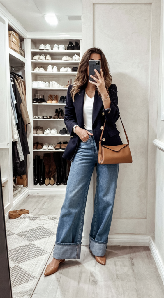 1. Cuffed Wide-Leg Jeans With a Polished Navy Blazer