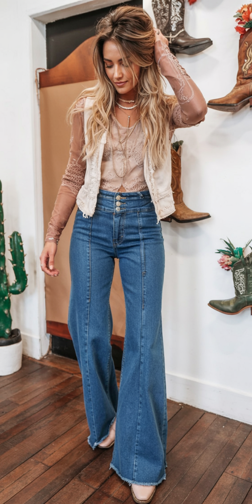 This has a romanticized version of the music fest aesthetic: high-waisted and flare-leg jeans “Flare Blue” jeans from Levi’s paired not only with a lace camisole but also a fringed vest over a series of necklaces. It’s the essence of music fest in the best possible way—mature enough to be part of everyday wear but young enough to be exciting and fashion-forward. The high waistline and flared legs create the illusion of legs going on forever, and the colors are couched in enough understated chic that the overall effect doesn’t feel super flashy. In contrast to the typical straight cut of “mom” jeans or the classic “straight” cut of jeans in general, this flare cut provides an entirely new type of silhouette. The jeans will skim through the waist and upper part of the hip before flaring sharply at the knee. This shape helps offset wider-set shoulders while also adding a curve to an upright figure. Chances are you’ve been rocking the wide-leg trend up until this point, but when you throw on the bell-bottom cut of jeans, you’ll immediately offer yourself a fresh new aesthetic option in early 2026 and beyond. Simply combine the new jeans code with the addition of ankle boots in the fall and cute sandals in the spring to access the same boho-luxe fashion concept without expending the same level of effort.
