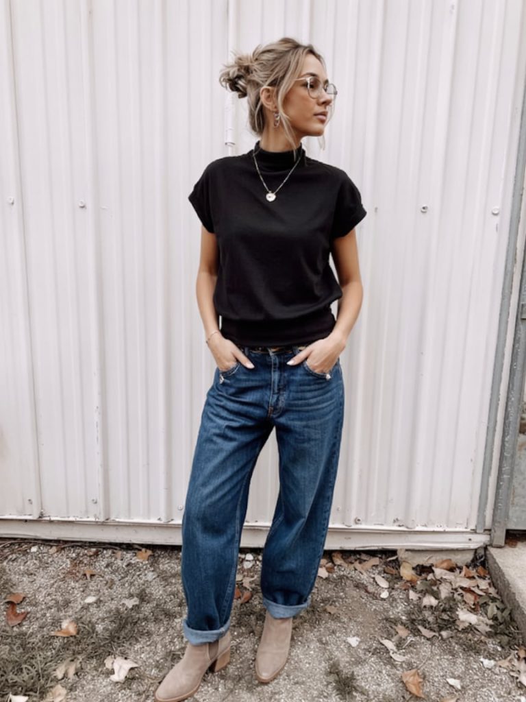This combination has a certain understated chic: the streamlined black mock-necked tee positioned above the dark blue baggy jeans that sport a big cuff. It has a bit of an artsy feel, as if taken directly from the pages of Street Style, and has tons of adult appeal. The role of the cuff is to display the ankle boots. This will provide enough edge to the overall setup without looking impractical enough to be worn in everyday circumstances. This particular outfit will remind you that sometimes the best fashion statement can be achieved through minimalism.