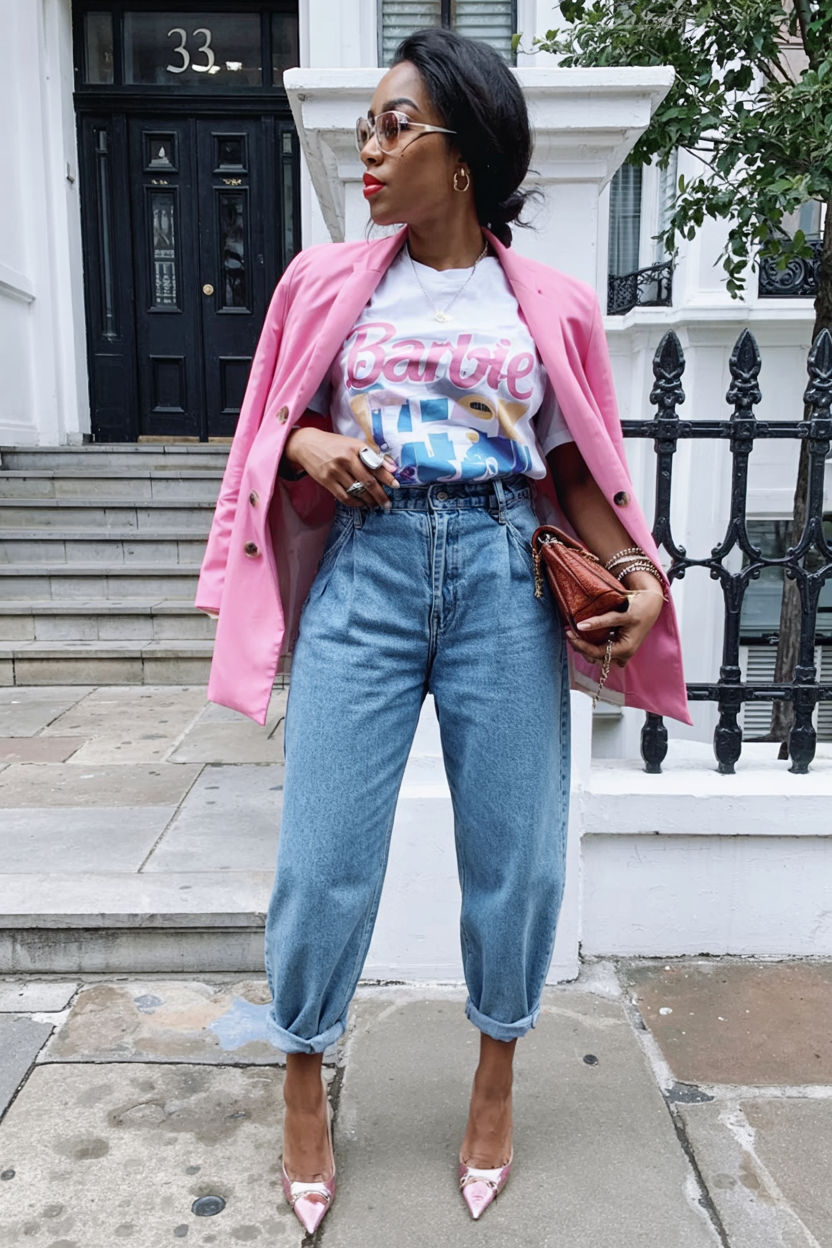 10. Playful Pink Blazer and Mom Jeans Street Style