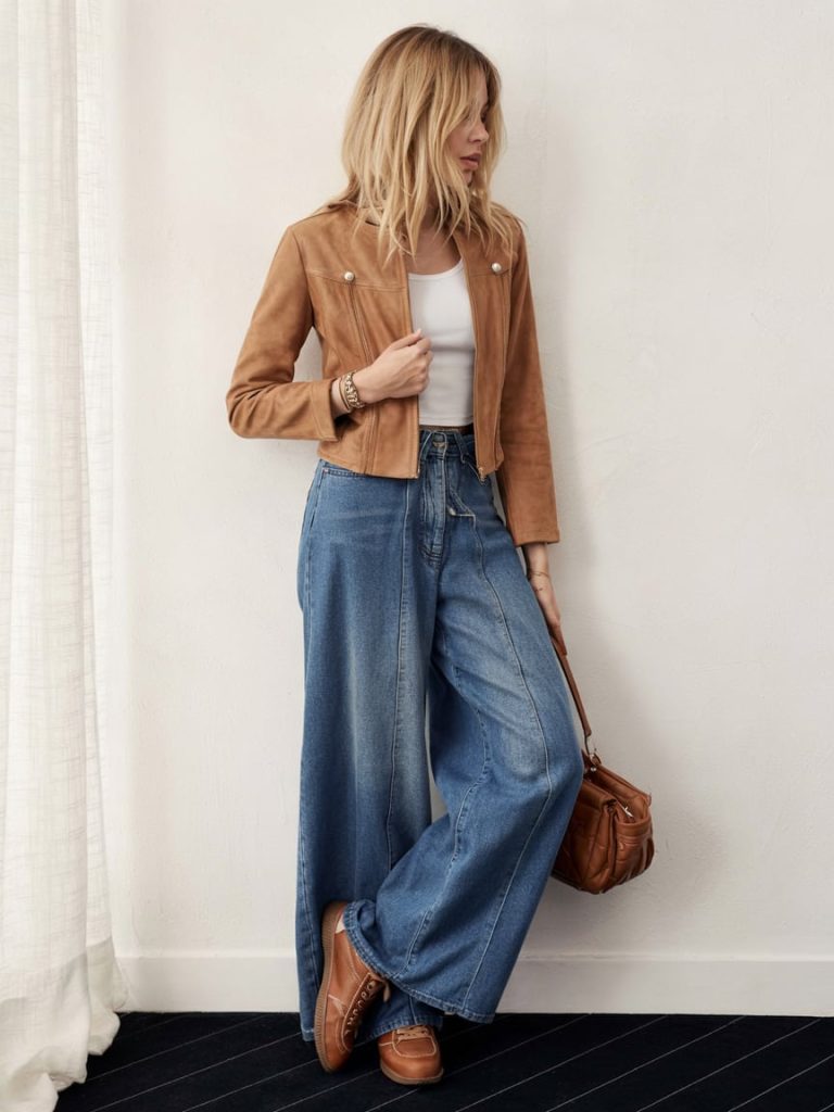 To create this silhouette, let the jeans speak for themselves. As wide-leg jeans are already voluminous, the upper garments should be slightly cropped or tucked in at the front to prevent the waistline from disappearing. A brown or beige belt will ground the ensemble and prevent it from looking floated. The final step will be stacking bracelets and/or adding a pair of gold hoops—the rest will be a chic summer/fall combination that effortlessly transitions from a boho collection to a streamlined capsule collection while allowing you to express lots of personal style.