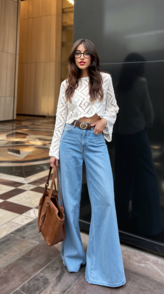 This graphic tee and wide-leg street-style denim outfit has attitude oozing from its simplicity: graphic tees paired with wide-leg light blue jeans that almost graze the ground and white graphic sneakers. The addition of the black handheld and shades will jumpstart the fashionista in you right in the middle of the busy street. This denim fashion trend in 2026 will give you the quick fix of cooler-than-you fashion the minute you step out the door. The difference this styling makes in the way you feel is enormous: this outfit makes you feel at once comfortable and also incredibly powerful. The loose-fitting wide-leg denim doesn’t hug you anywhere, which is a lifesaver during busy days of the week when you’re in a rush to get through the day before the witching hour of evening arrives. However, the graphic T and sharp accessories will ensure you fail to disappear behind the folds of the loose-fitting jeans. This is the outfit you turn to when you’re feeling drained, late, and not at your best because you know that the moment you put this outfit together, you’re going to own the day.