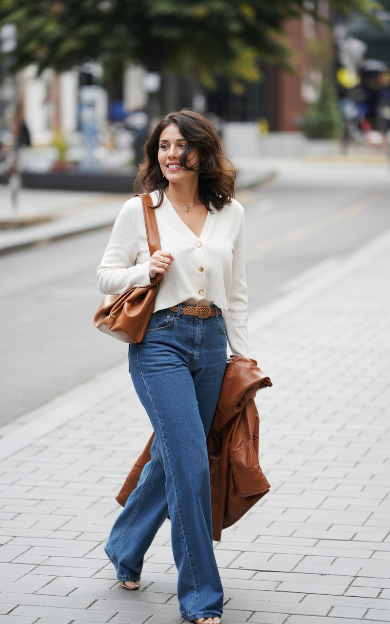 This can be your “got this” uniform when you’re busy. This creamy cardigan, dark blue wide-leg jeans, and earthy brown accessories combine to create a look that’s together without trying hard. The high waist and extended hem give you the legs-for-days feel, while texture from the knitted and woven belt creates visual interest. It’s an effortless combination that goes from hauls to pickups to dinner without missing a beat and feels perfectly fall-to-spring.