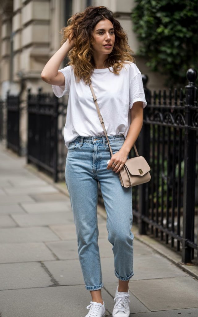 This type of outfit makes you feel like you can catch your breath the moment you step into it. A simple white tee paired with lightweight blue mom jeans and white sneakers makes this the simplest yet best type of summer strolling outfit in the city. There’s nothing pretentious or overly dramatic about this combination of pieces, but the proportions work together in the best possible way—that’s the point of the Jeans Outfit 2026 collection: styles meant to move along with you through life rather than against you.