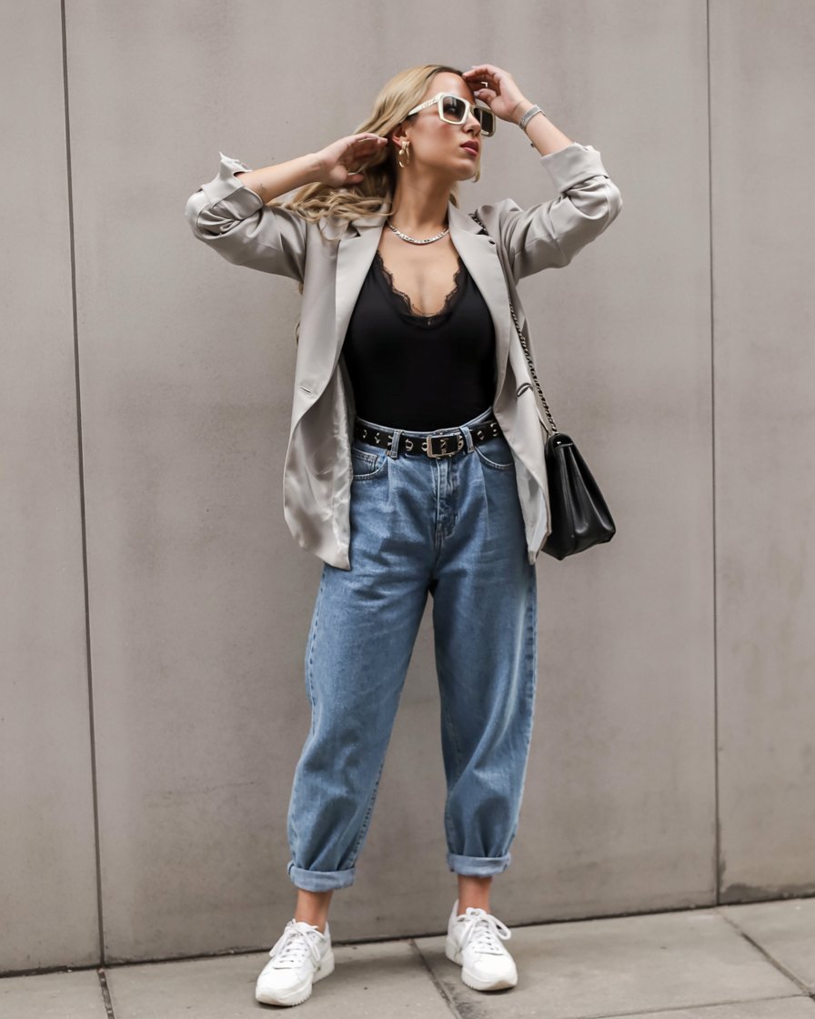 If you’re keeping up with the trends, you might notice the strong return of loose mom jeans and barrel jeans. They offer a relaxed alternative with plenty of room through the hips and thighs that’s perfect for so many women. To give this fashion trend a modern twist, you can wear this blue jeans pair with something streamlined against the torso: a bodysuit, a tucked-in T-shirt, and/or a simple camisole paired with a blazer. The juxtaposition of being streamlined at the top and loose at the bottom makes this particular fashion trend feel so fresh right now.