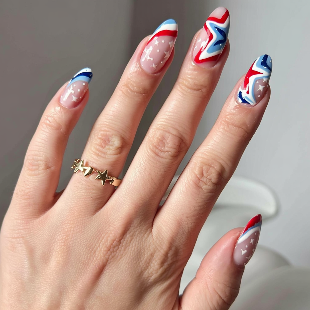 An almond-shaped acrylic manicure uses sharp-edged stars between red, blue and white swooshes to deliver a spectrum of patriotic charm. The manicure design projects retro themes that remain current and polished. Those who want stylish nails without complicating details will appreciate this edgy yet straightforward design. This patriotic design is perfect for beach picnics on Independence Day and is a great choice for Fourth of July weddings.