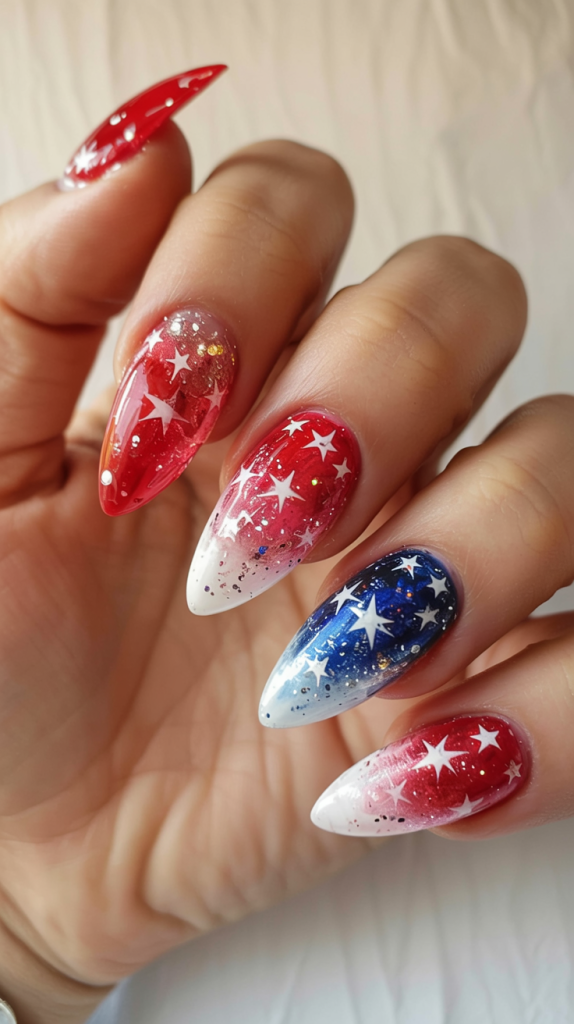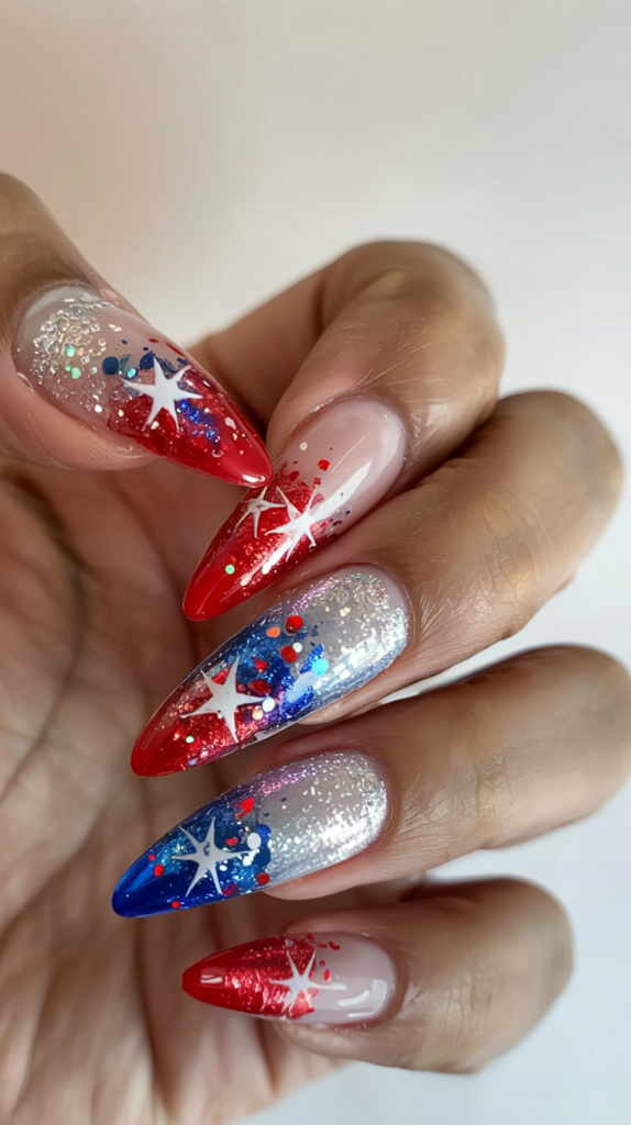 The pointed acrylic manicure features a glittery ombré transition from red to white to blue with starburst accents for those looking for extra sparkle. This bold, dramatic style is made for fireworks. The high-impact ombré design works well for birthday celebrations as well as exclusive Christmas, July and evening events.