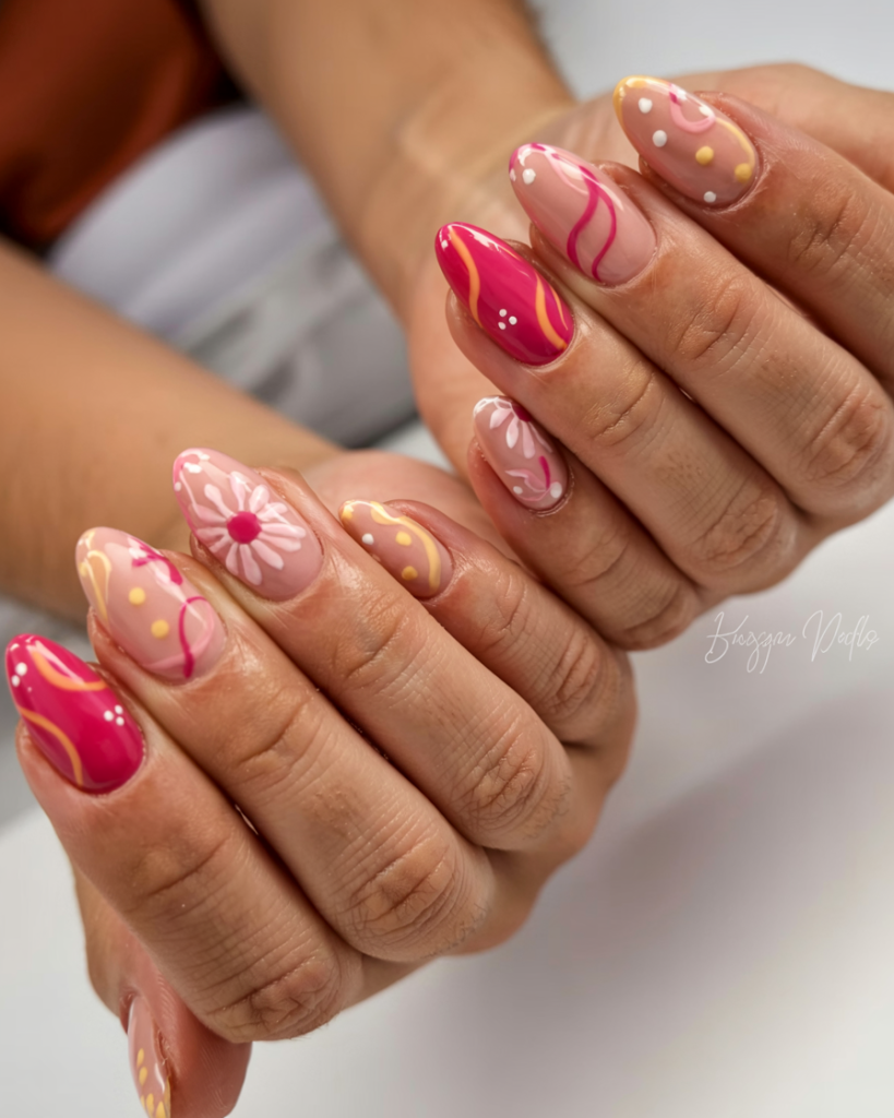 Under the almond-shaped gel nails is a delightful summer explosion of joy. The nail art design includes daisy ornaments and soft white and pink lines with polka dots for a cheerful summer effect. These nails bring a playful sophistication that would be perfect for those looking for sun-inspired designs that maintain both style and artwork quality. This cheerful nail design will delight guests at backyard birthday parties and beach outings as it is perfect for both brunch celebrations and casual outdoor activities.