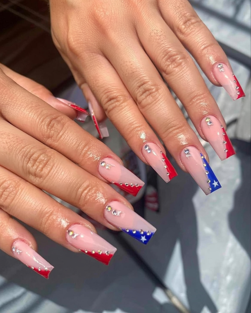 Acrylic coffin nail designs bring a complete result to people who want strong and minimal nail finishes. Rhinestone illumination outlines the red and blue nail tips split across the diagonal section, while delicate white star elements decorate the edges to provide both sparkling appearance and textured definition. Among the top ideas 2025 nail enthusiasts will find this style exceptional as it suits those who want symmetrical designs with glamour. Ideal for a wedding guest outfit, especially during patriotic celebrations.