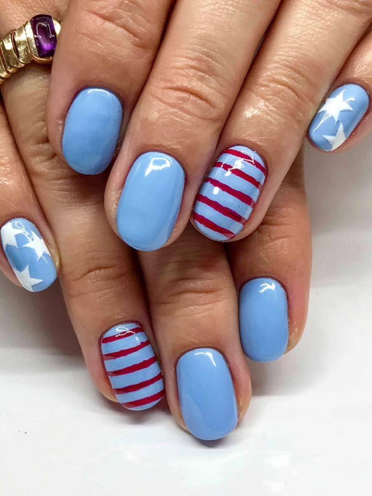 The minimalist short natural nails design features cold-friendly baby blue colors that add sentimental value to the July Nails 2025 trend. The design combines American red stripes with white stars to create a minimalist representation of Americana. The design remains basic enough for office days but reflects high fashion ability. Great for work environments or casual birthday get-togethers.