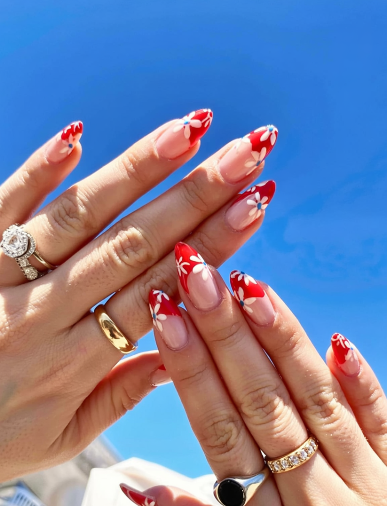 Set against a nude base, these bright red tips bloom with delicate white daisy petals and blue centers. The almond nail shape provides a feminine touch suitable for summer weddings or brunch events along with bridal shower celebrations. The gel nails finish provides a perfect shine, while the floral pattern makes this one of the most delightful summer ideas of the season.