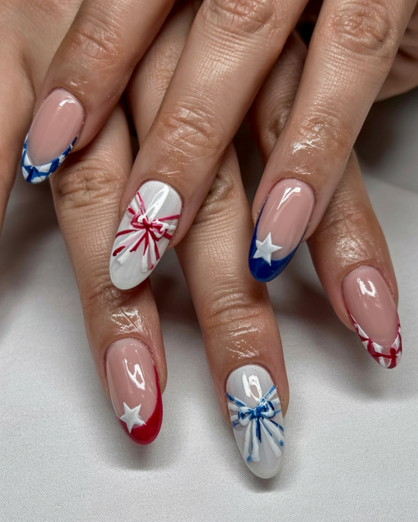 The sophisticated use of symbolic elements, including clean line work with white stars and red and blue bows, is the unique design feature of this creation. The almond design brings elegance to your nails while following the anticipated 2025 summer nail designs. This look is perfect for backyard weddings and summer celebrations where guests want to celebrate without showing off their American pride.