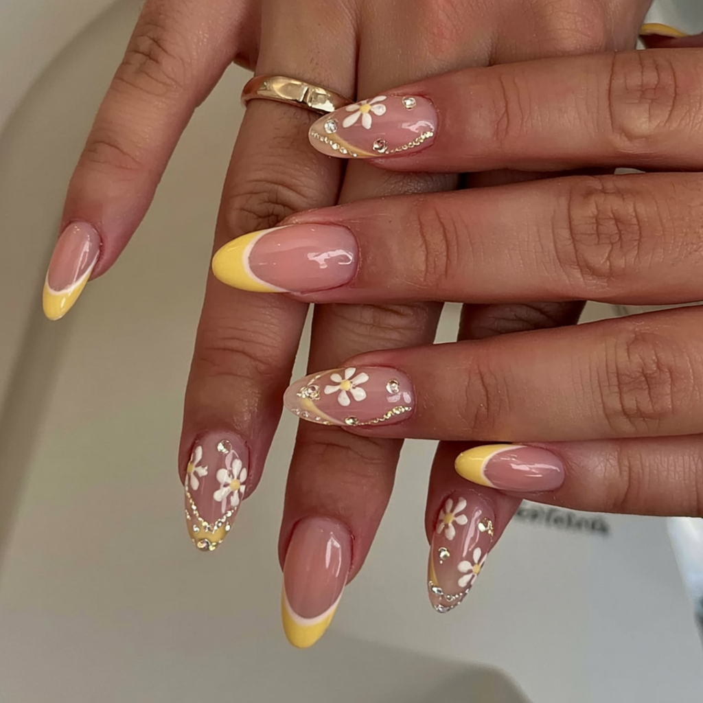 A soft yellow version of the French Tip manicure is the epitome of summer cuteness for all soft girl enthusiasts. The design features white daisies and small rhinestones, yet is subtle enough for everyday wear that brings out summer elements. Dip nails have the perfect blend of durability and attractiveness for outdoor birthdays at the beach and summer get-togethers in floral dresses and sandals.