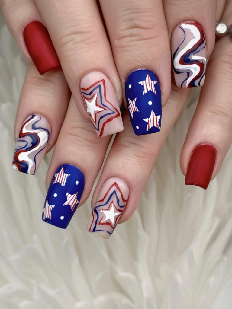 The retro design is made bold with square nails that form an intricate pattern of stars, stripes, abstract loops and red, white and blue elements. This design blends classic nostalgia with contemporary style for people who enjoy vibrant acrylic designs. Both icy and traditional inspirations come together in these designs to suit July parades as well as Christmas in July celebrations and rooftop fireworks.