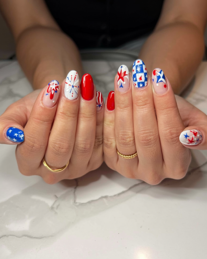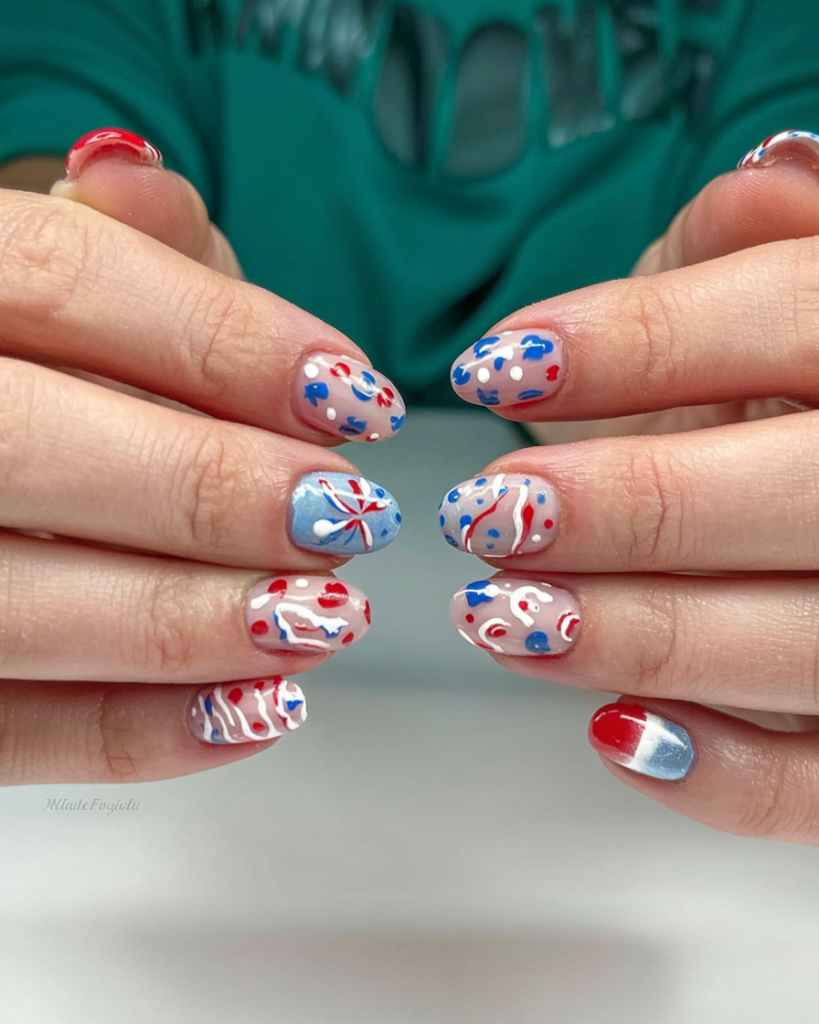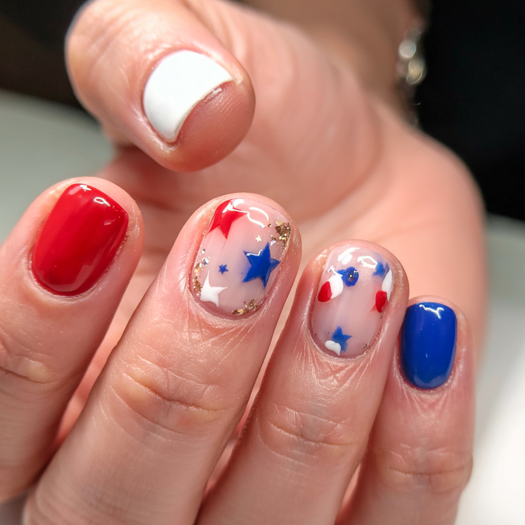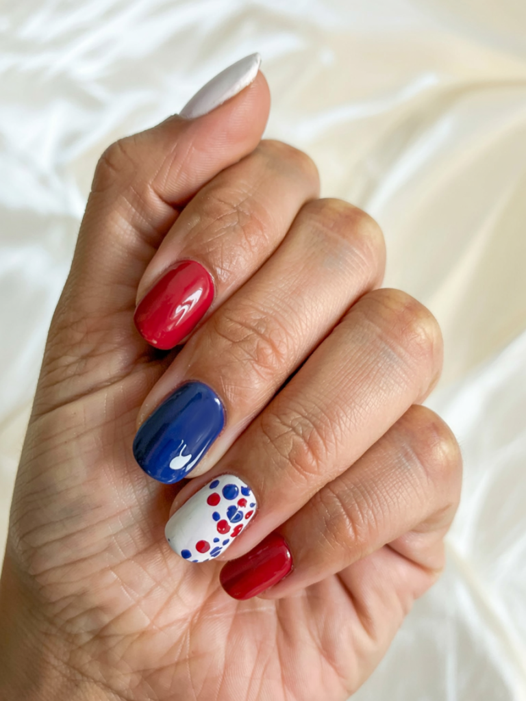 A round shape and short length define these natural nails, which maintain a clean and elegant look while incorporating July’s signature color scheme. An accent nail features red and blue dots on a white background, creating a simple but fun design that users can easily recreate. The style serves as a modest representation of national pride that remains popular among those who prefer unpretentious fashion looks.