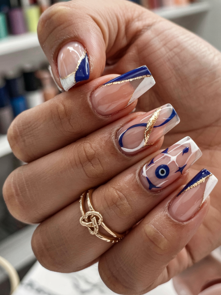 July’s nail trends welcome the “evil eye” motif with this French navy and gold design that adds a cosmopolitan touch to your look. The overall modern luxury feel comes from the negative space along with the metallic accents that combine with the symbolic detail to create spiritual energy. Acrylic nails designed with this unique style will match the style of stylish vacationers for 2025 and work well at beach wedding ceremonies.