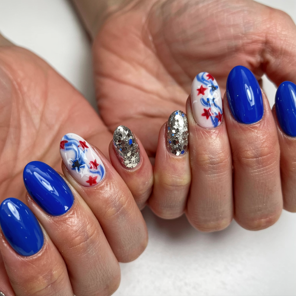 The entire look marks a special celebration with a dual metallic look that blends royal blue gloss with silver glitter. The design layer uses detailed red and blue star patterns on a white base, while royal blue gloss is combined with silver metallic glitter. This elegant design makes your gel nails the center of attention for those who want to show off their nails without saying a word. People who dance in fireworks or enjoy cocktails on the patio will find this set provides an exceptionally shiny and vibrant experience.