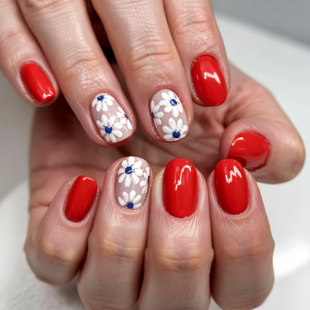 A contemporary floral design that adds daisies while embracing red, white and blue color schemes creates this trend. A harmonious balance is created when solid red nails meet translucent base accents attached to the floral decorations. This design brings summer garden party elegance to wedding guests as well as garden party attendees during the summer months. The gel nails create a regal appearance with their playful nature.