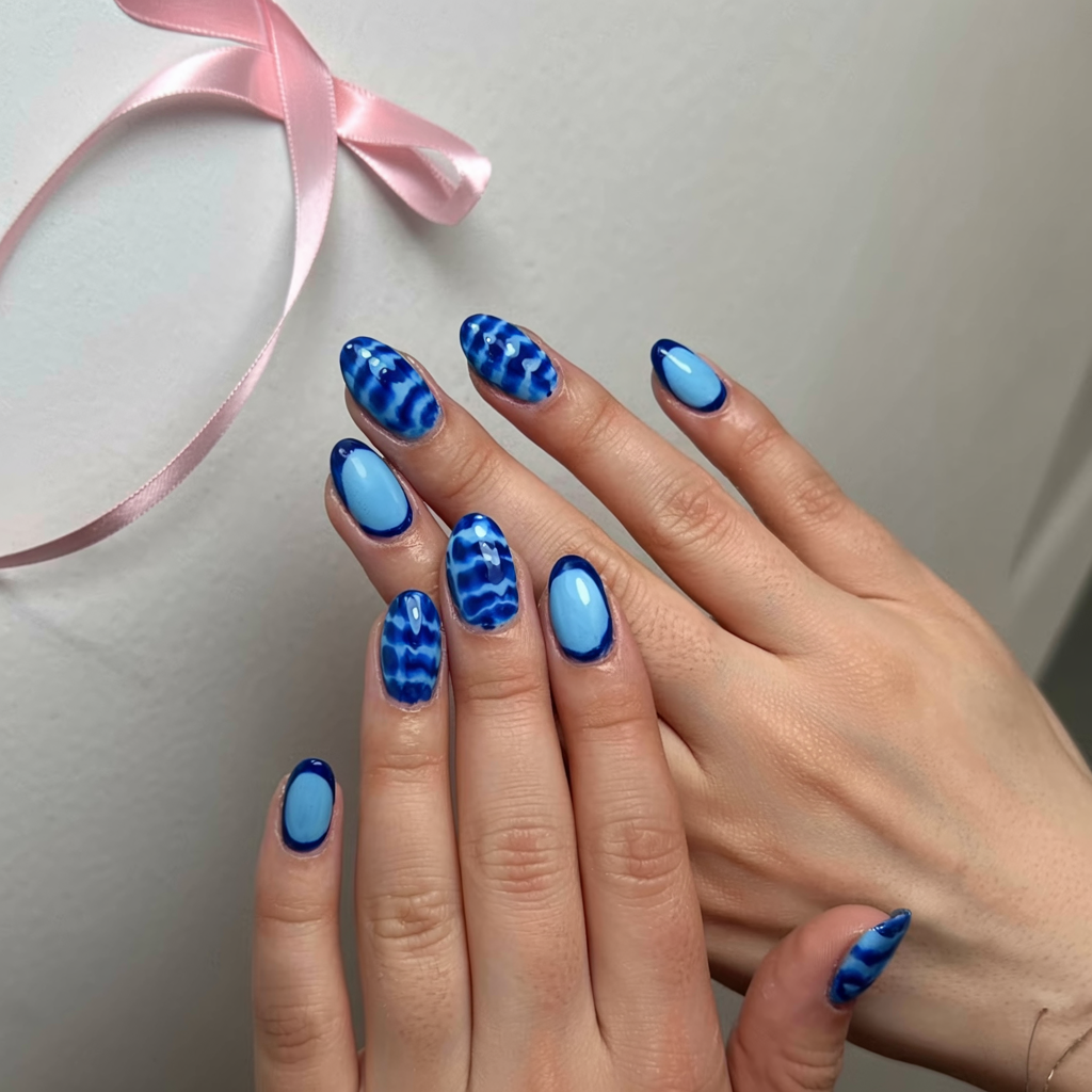 Instead of sticking to the traditional July color scheme, this nail design falls into the refreshing maritime tones of summer 2025. The combination of different shades of blue with reflective wave patterns along the nails creates a fantastic aquatic look. Beachgoers and sunbathers alike will enjoy these fashionable nail designs that perfectly capture the essence of summer.
