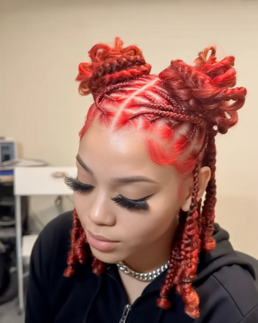 Okay, this one is pure joy. The bright red, the playful buns, the little twisty pieces—everything about it says you’re not here to blend in. It feels youthful without trying too hard, and it has that creative, artsy vibe that turns a basic outfit into a whole look. Plus, the neat parting keeps it from feeling messy—so it still reads polished. If you’ve been stuck in the same hair routine, this is the reset button.