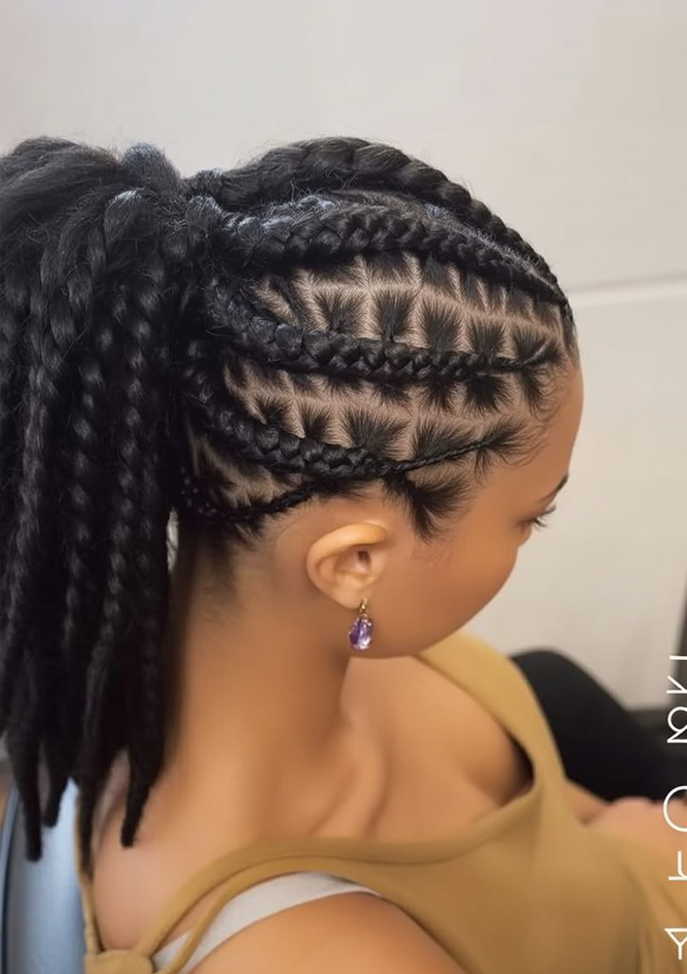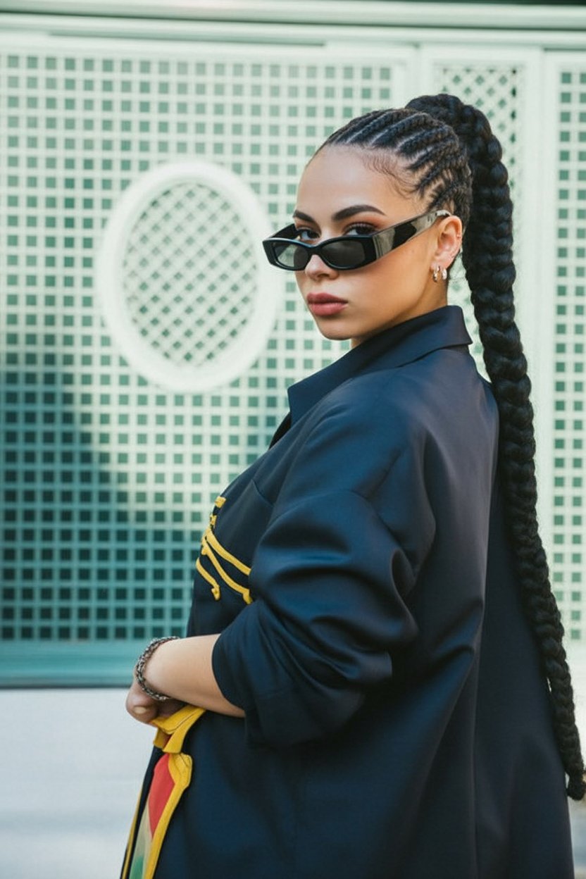 This high ponytail is pure power—sleek at the scalp, then suddenly it turns into a dramatic, long statement that moves when you move. It’s giving “don’t underestimate me,” but still looks polished enough for a meeting. The clean braid work makes the whole style feel expensive, like you planned your outfit around it (even if you didn’t). And those tight lines at the front? They make your face look instantly lifted.