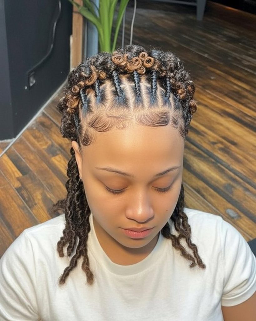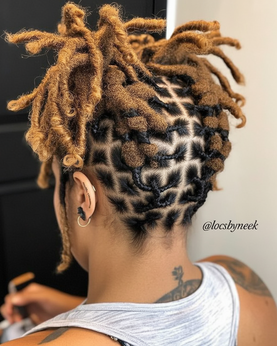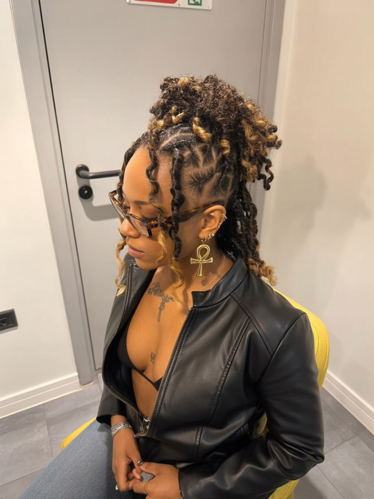 There’s something wildly confident about a loc look that’s neat at the roots but free and playful on top. This style gives that “I’m booked and busy, but I still came to slay” energy—clean geometry underneath, then a little honey-blonde attitude in the locs themselves. It reads artsy, polished, and just a bit rebellious, like the hair version of a great leather jacket with the perfect broken-in fit.