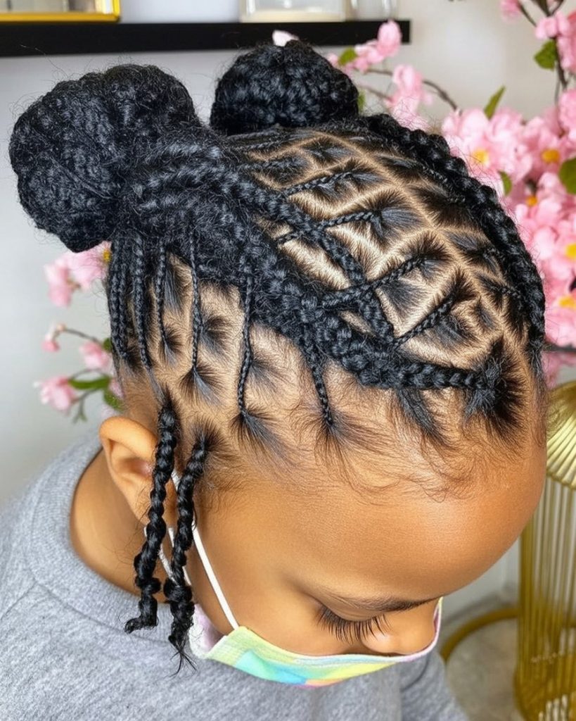What makes it unique is the contrast: smooth, precise sections up top with two bold buns that hold their shape. It’s an easy, protective look that keeps hair controlled while still feeling fun. If you’re working with shorter lengths, keep the buns compact; if you have more density, you can make them fuller without adding weight. A little mousse on the parts, a scarf at night, and gentle scalp oiling will keep the look crisp and comfortable through 2026.