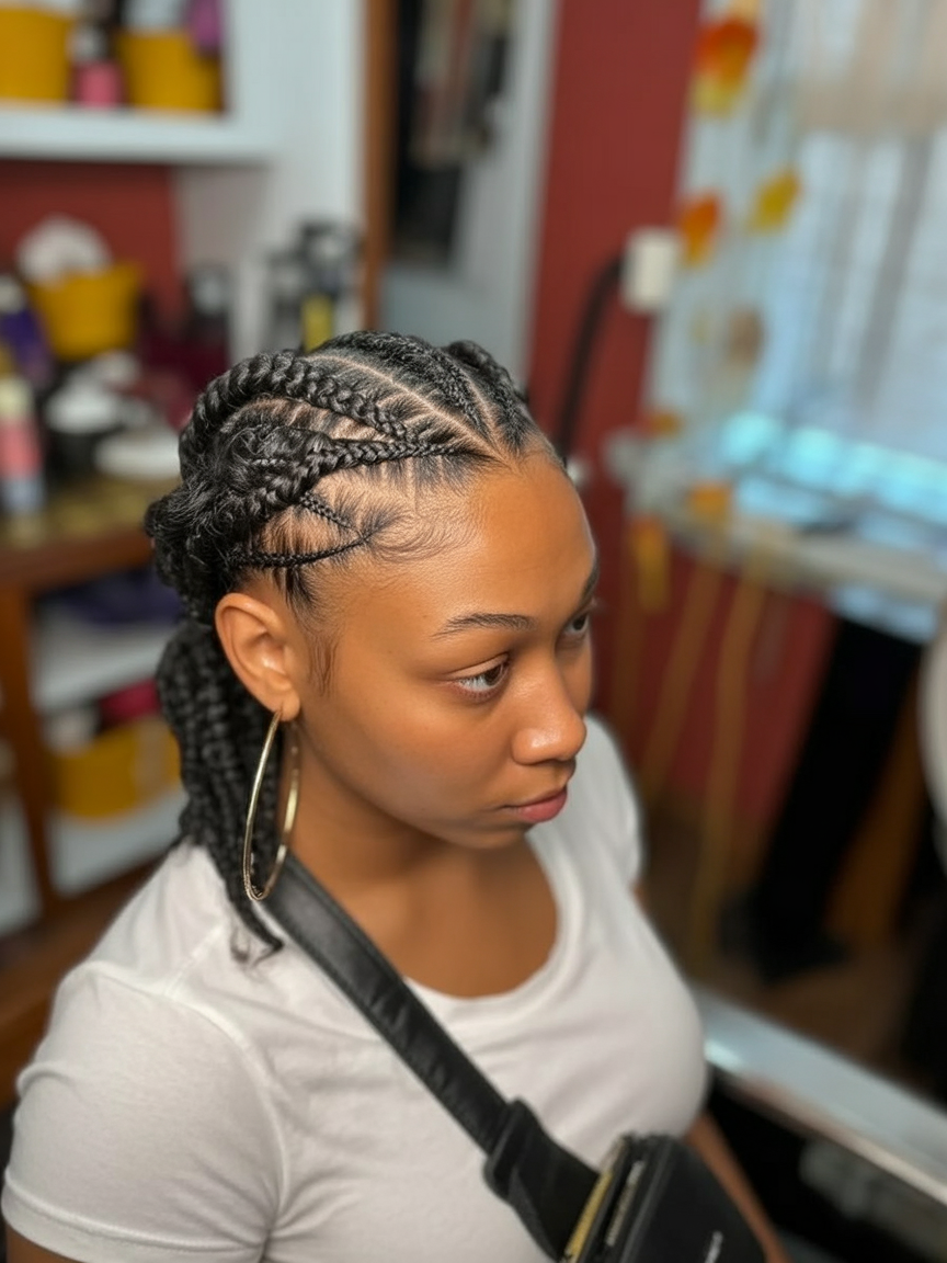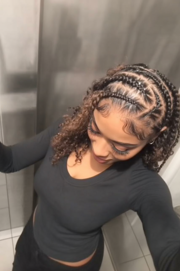 This style is such a confidence booster because it gives you structure and softness at the same time. The cornrows create that clean, lifted shape through the crown, while the curly length feels romantic and full. It’s the kind of hair that looks “styled” even when you’re just living your life—running errands, showing up to work, or stepping out for a casual dinner. It feels fresh, flattering, and very grown.