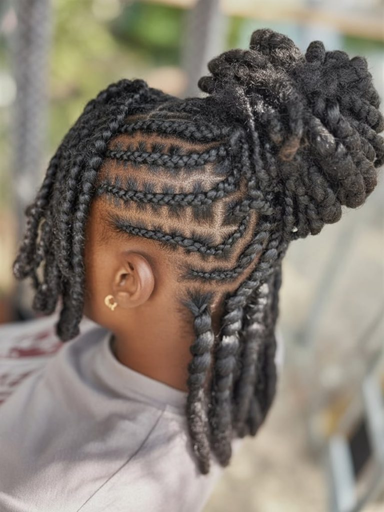 This style has that “special occasion but make it everyday” vibe. The braids sweep back like a soft crown, and the locs gather into a compact updo that looks tidy, bold, and a little artistic. It feels protective and pretty at the same time—like you can run around all day and still look like you planned your hair on purpose. There’s something so satisfying about a look that stays neat and still feels expressive.