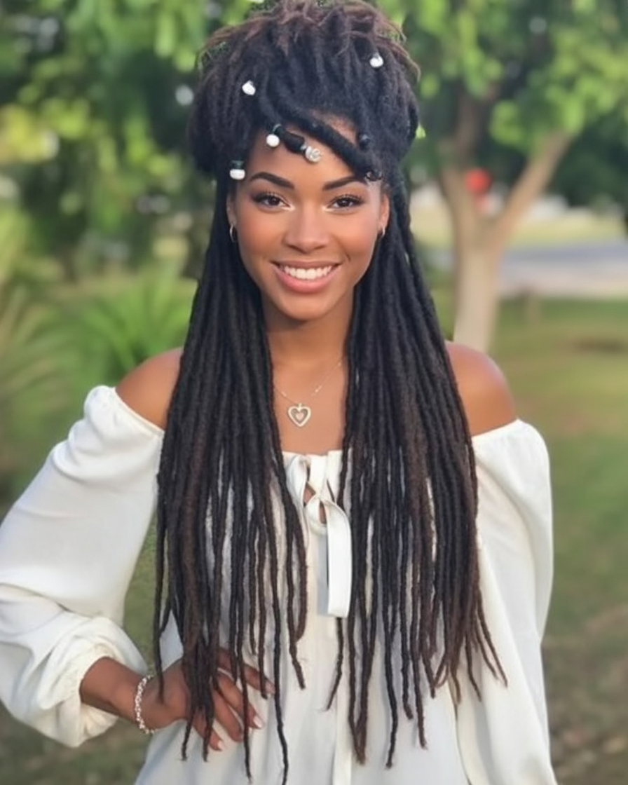 What to wear it with: gold hoops, a soft nude lip, and anything with an open neckline—think off-shoulder tops or a simple sundress. Lean into loc jewelry ideas like beads or cuffs for that extra sparkle without going overboard. This works beautifully on long locs that are already mature, or you can build it with faux length if you’re not there yet. Keep the half-up locs secure with a gentle band, and wrap the front at night so it stays cute for 2026.