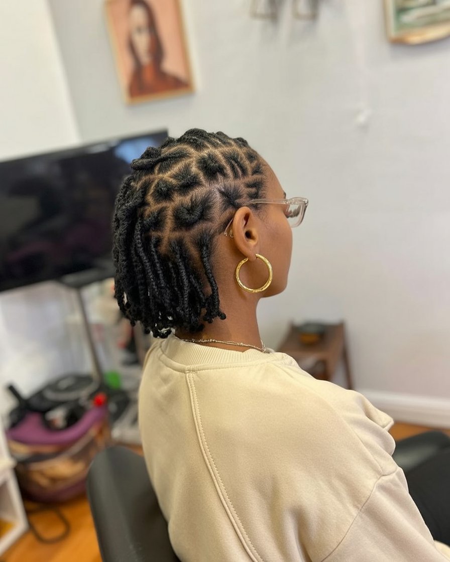 Low-maintenance angle: because it’s short and lifted, you’re not fighting frizz or heavy length all week. It’s a strong option if you want a short style that still reads dressy, and it holds up beautifully with a simple nightly wrap. Keep the scalp moisturized with a light oil, and use mousse to keep the shape neat without stiffness. If you’re maintaining locs, schedule your retwist so the parting stays crisp for 2026 without constant touch-ups.